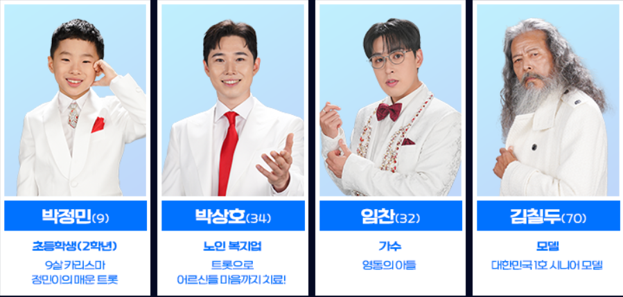 답변3 최고령 김칠두, 최연소 고은준, 성악가 듀엣 트로페라 등이 주목받고 있습니다.