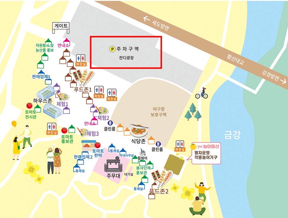 - 주차장은 행사장 바로 옆 공터와 금강 3공구야생초화원 공원 주차장을 무료로 이용할 수 있습니다. 주차 안내 요원과 자원봉사자가 많아, 혼잡한 시간에도 비교적 수월하게 주차할 수 있었어요.