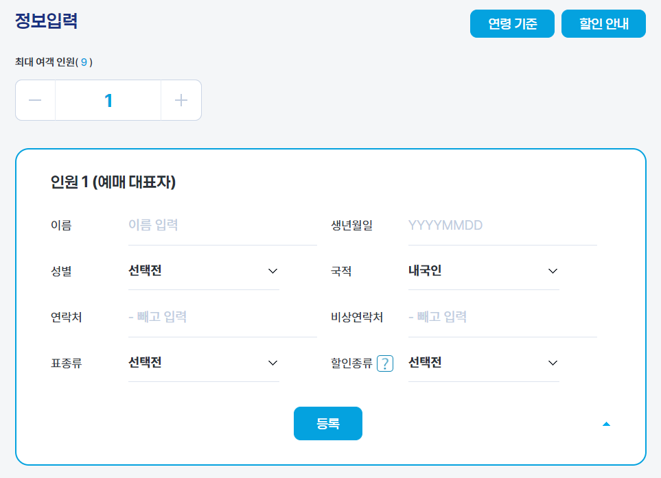 대표 예매자를 개인정보를 입력해 주세요. 비상연락처까지 빠짐없이 입력해주셔야 합니다.