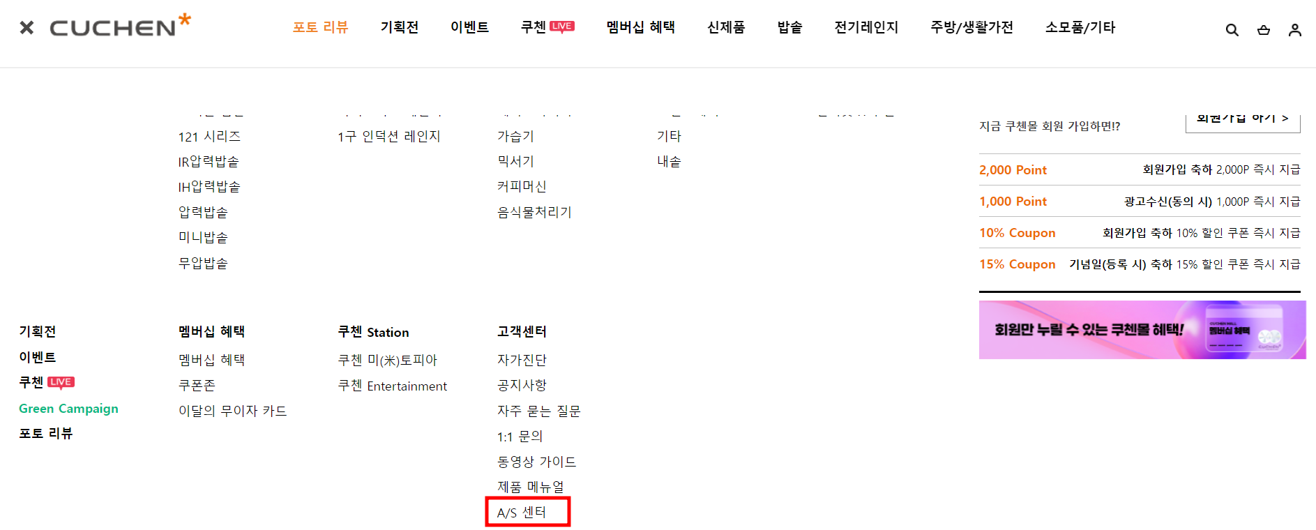 쿠첸 홈페이지에서 삼선 (三)을 누르시면 고객센터 탭 아래쪽에 A/S센터 탭이 있습니다.
