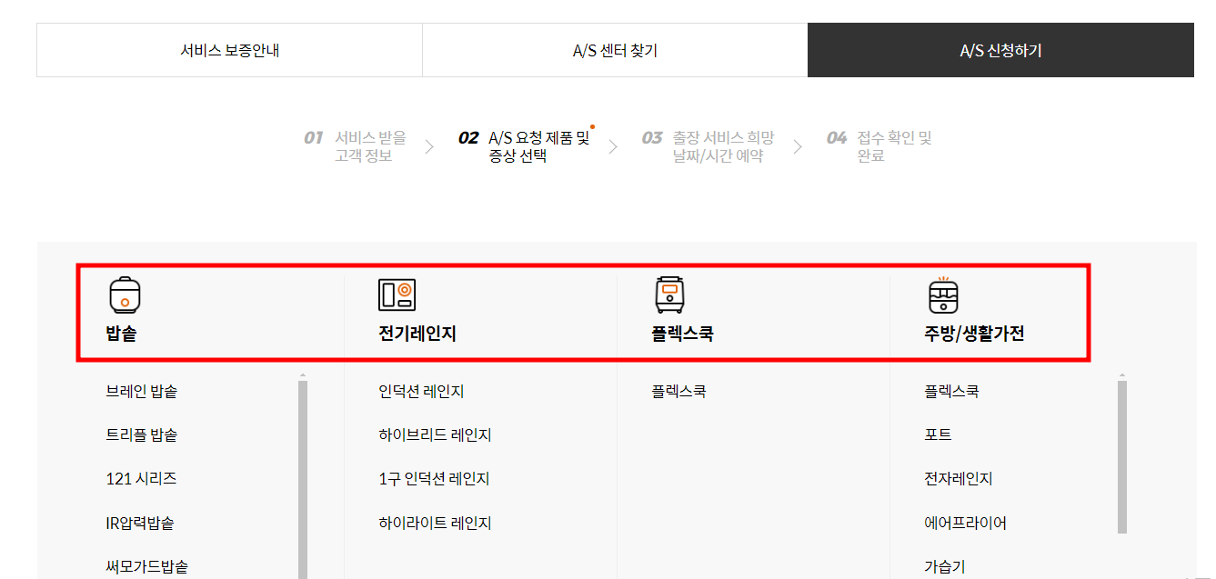 쿠첸제품 중 서비스받을 제품을 선택하세요