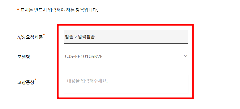 서비스 제품과 고장증상은 필수 입력사항이니 반드시 입력해주셔야 합니다.