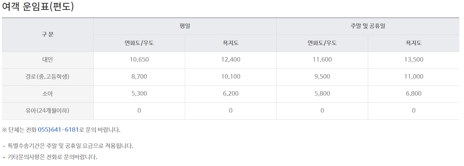 3️⃣통영항에서 연화도/우도, 욕지도까지 가는 배편 요금표