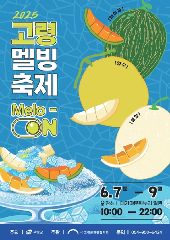 2025 고령멜빙축제, 올해는 Melo-ON이라는 새로운 테마로 더욱 특별하게 준비됐어요. 멜론의 달콤함, 빙수의 시원함, 그리고 음악과 체험, 불꽃쇼까지! 6월 7일부터 9일까지 대가야문화누리에서 여러분을 기다립니다. 궁금한 점은 054-950-6424로 문의해보세요. 더 궁금한 점이 있다면 댓글로 남겨주세요~