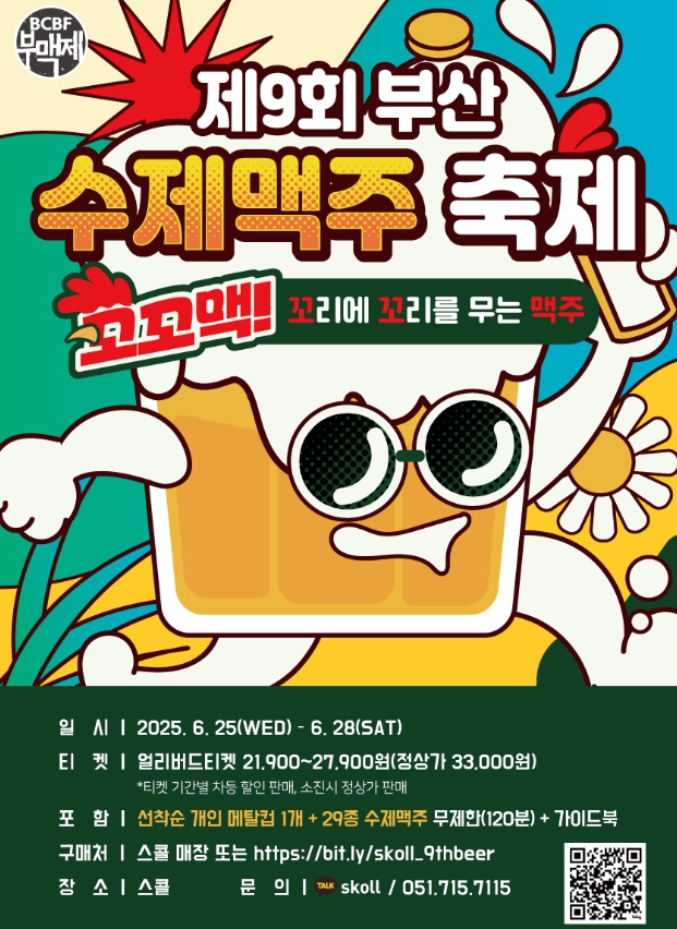 - 부산수제맥주축제 '꼬꼬맥': 6/25~6/28, 서면 스콜, 2시간 무제한 맥주 & 실내 쾌적함.