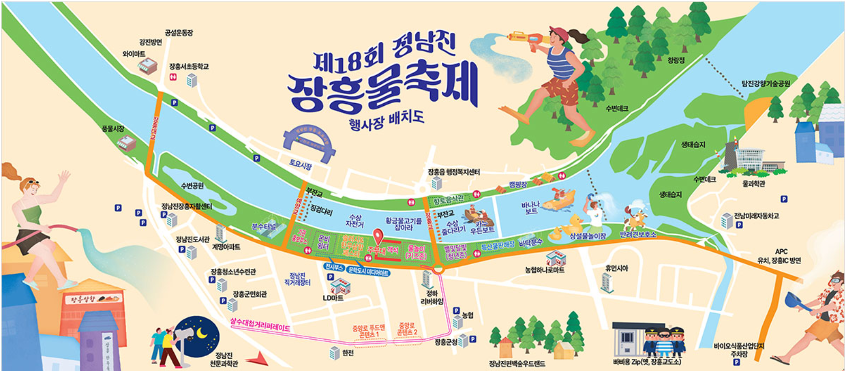 탐진강의 맑은 물과 숲이 선사하는 시원한 여름! 남녀노소 누구나 즐기는 대한민국 대표 물놀이 축제에서 올여름 최고의 추억을 만들어보세요.