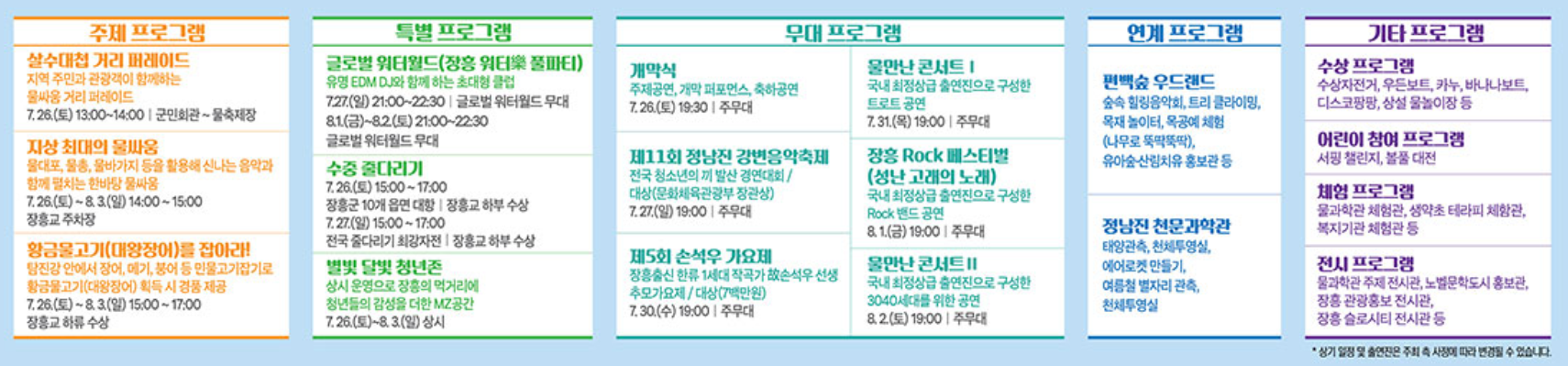 문화체육관광부 선정 문화관광축제로, 탐진강의 1급수 맑은 물과 청정 숲, 그리고 대규모 워터 페스티벌이 어우러집니다.