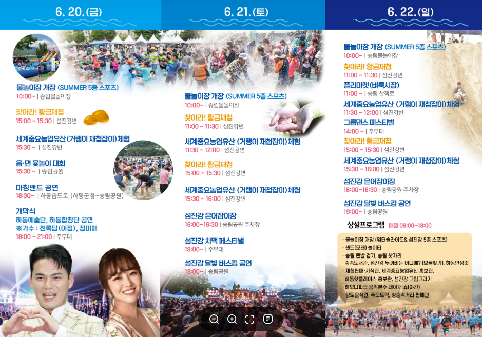 전통 거랭이 재첩잡이, 은어잡이, 그림그리기, 물총싸움, 윷놀이, 인생컷 촬영 등 남녀노소 누구나 즐길 수 있는 체험과, 가수 천록담(이정), 정미애 등 인기 가수의 공연, 치맥 페스티벌, 힐링 버스킹, 마칭밴드 퍼레이드 등 다채로운 무대가 이어집니다.