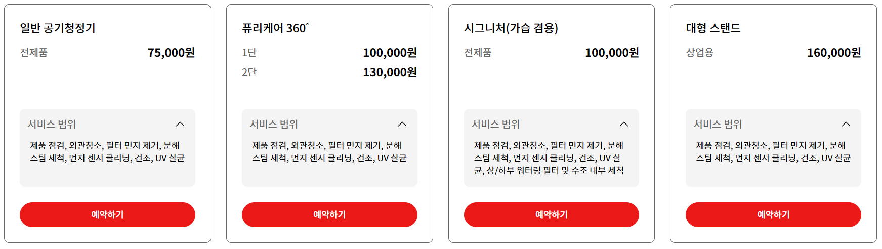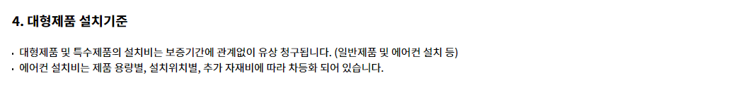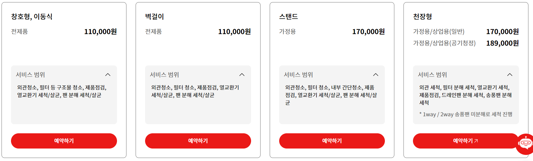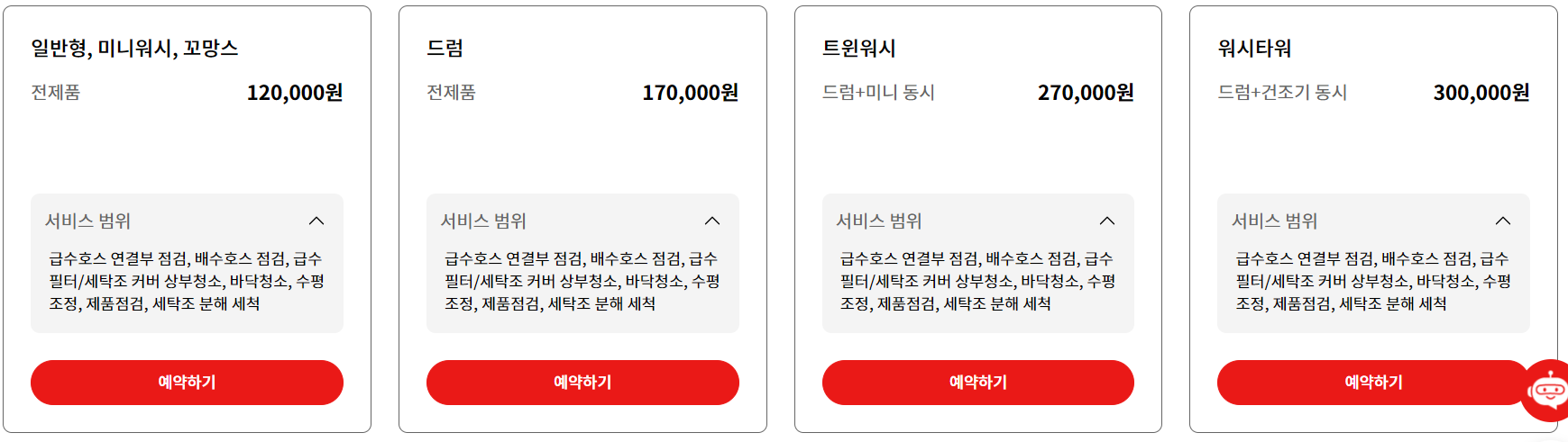 - 청소 비용: 세탁기나 에어컨 등 가전제품의 청소 비용은 제품의 크기와 상태에 따라 달라집니다. 정확한 비용은 서비스센터에 문의하여 상담받으실 수 있습니다.